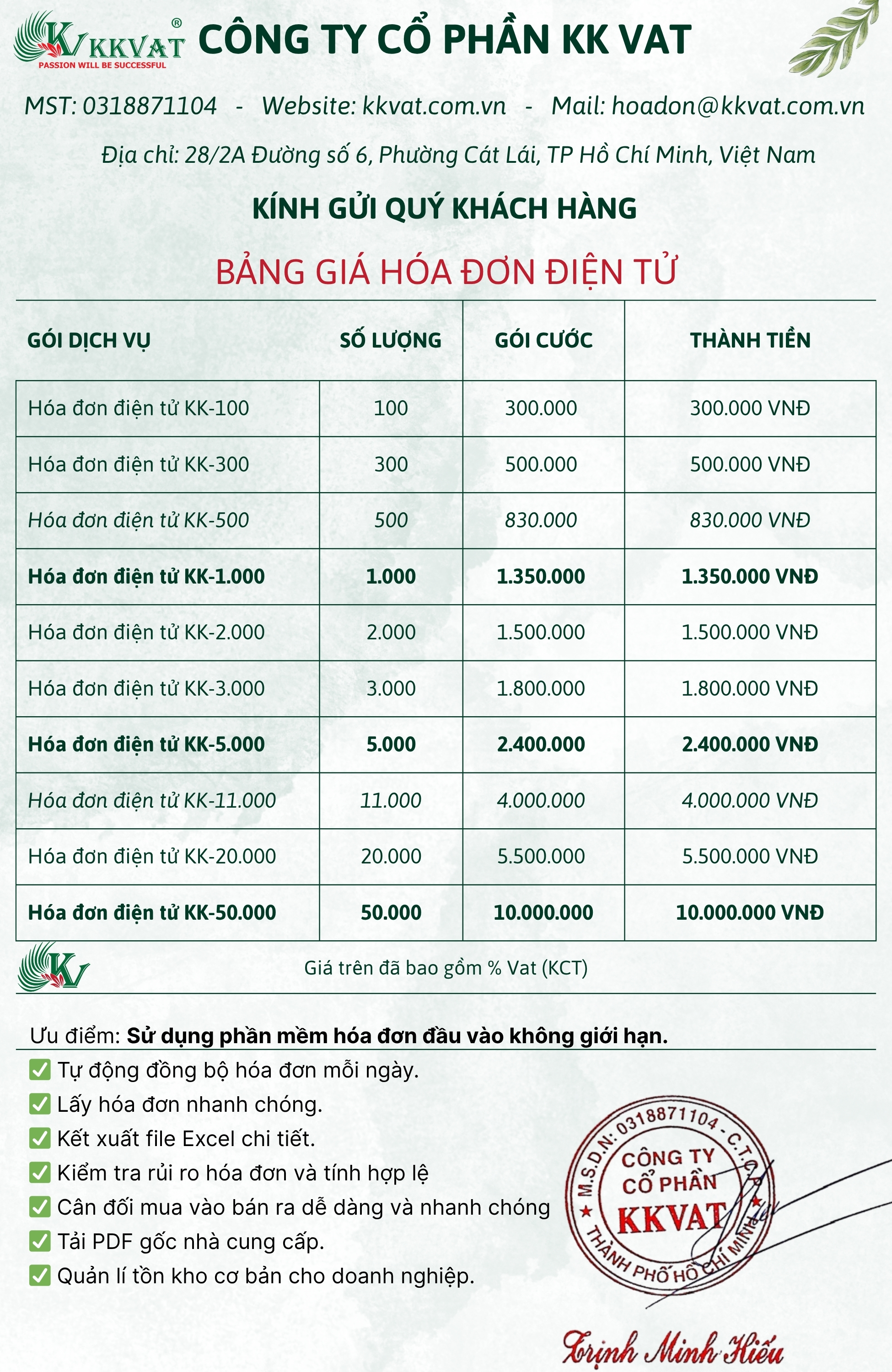 BẢNG GIÁ HÓA ĐƠN ĐIỆN TỬ KKVAT