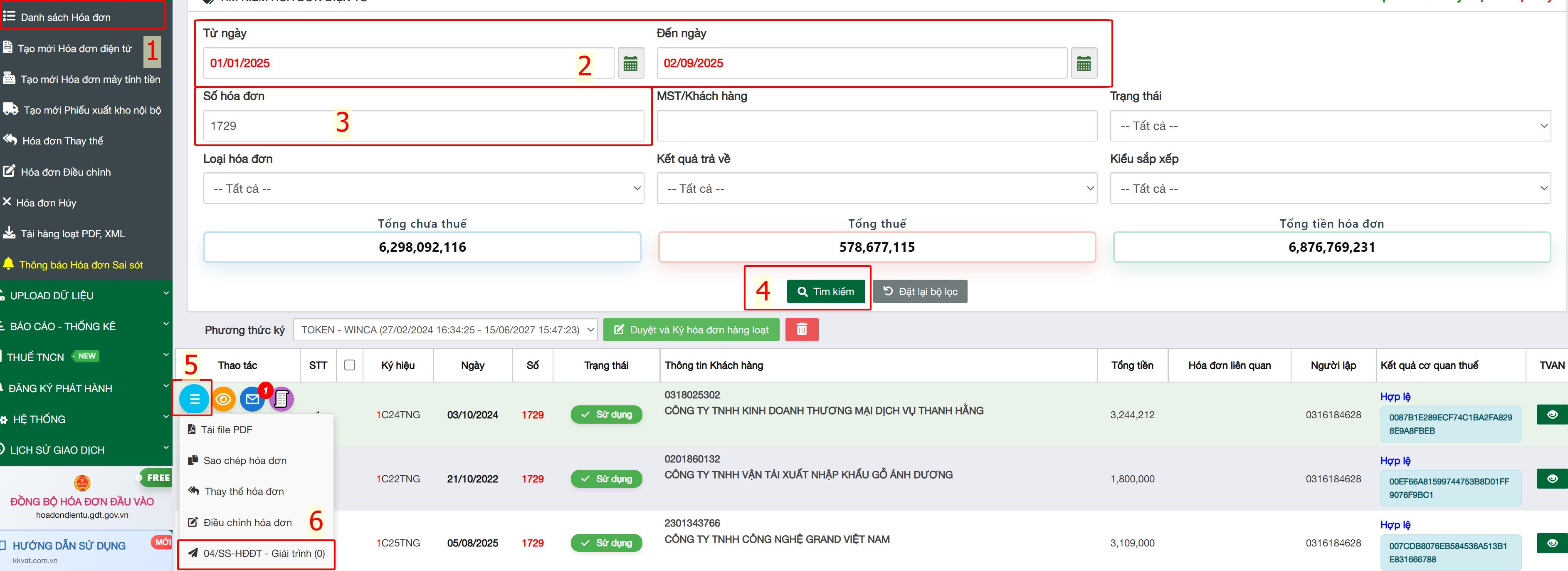 Từ menu hiện ra, chọn dòng "04/SS-HĐĐT - Giải trình" (vùng đánh dấu 6) để bắt đầu tạo giải trình cho hóa đơn đã chọn.