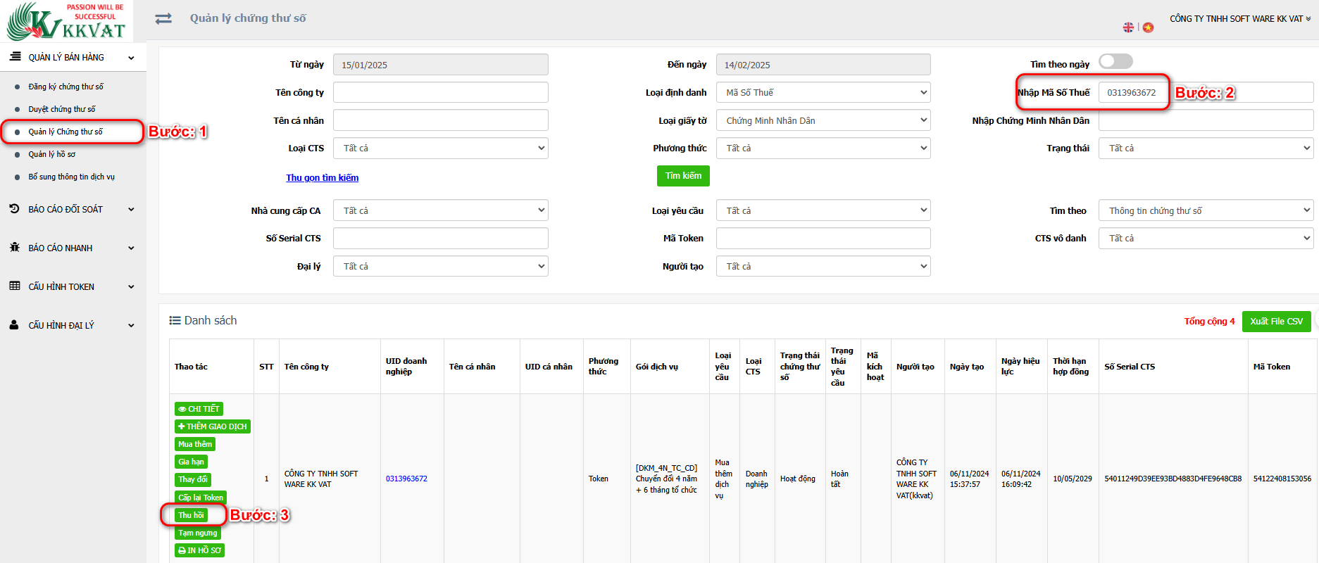 Nhờ hỗ trợ Thu hồi Và xóa trắng CTS trên token. DN đăng ký nhầm thông tin đơn vị. ĐL cam kết chưa đăng ký sử dụng cổng thầu cho CTS này.