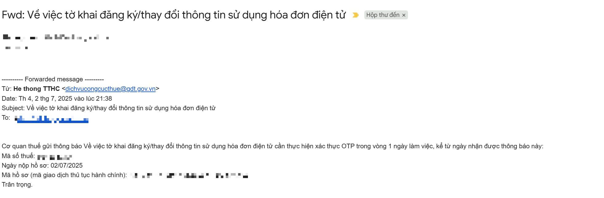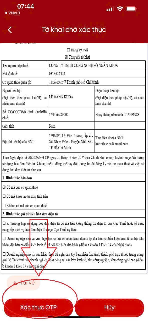 "Về việc tờ khai đăng ký/thay đổi thông tin sử dụng hóa đơn điện tử cần thực hiện xác thực OTP trong vòng 1 ngày làm việc, kể từ ngày nhận được thông báo này:"