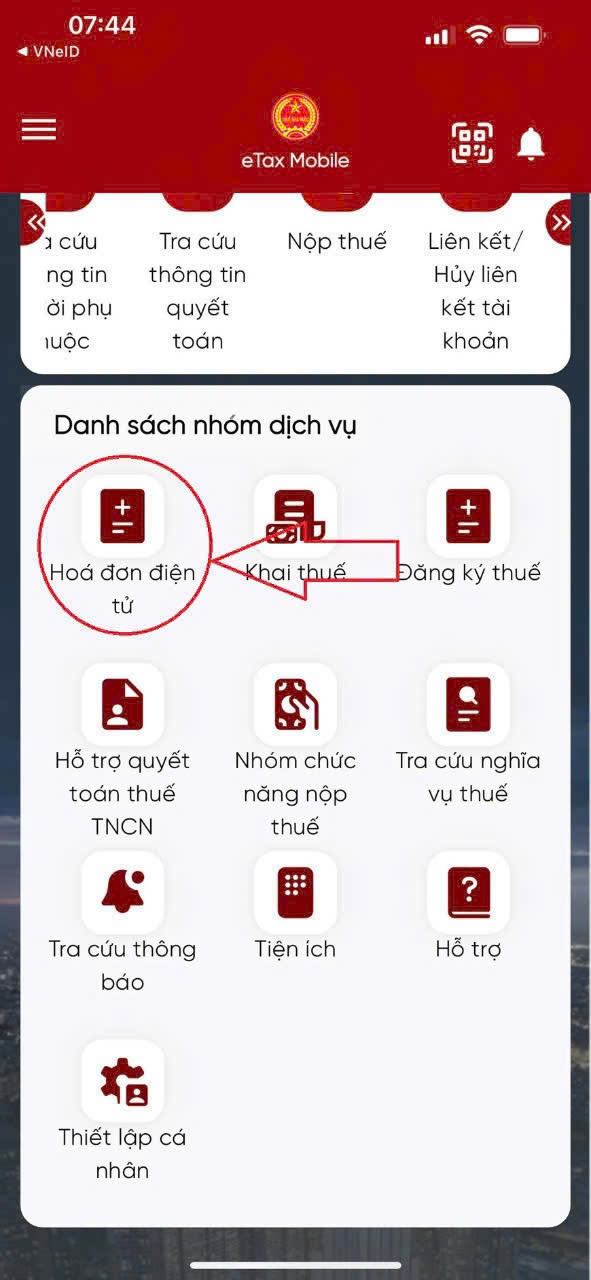 - Chọn mục "Hóa đơn điện tử" trong danh sách dịch vụ