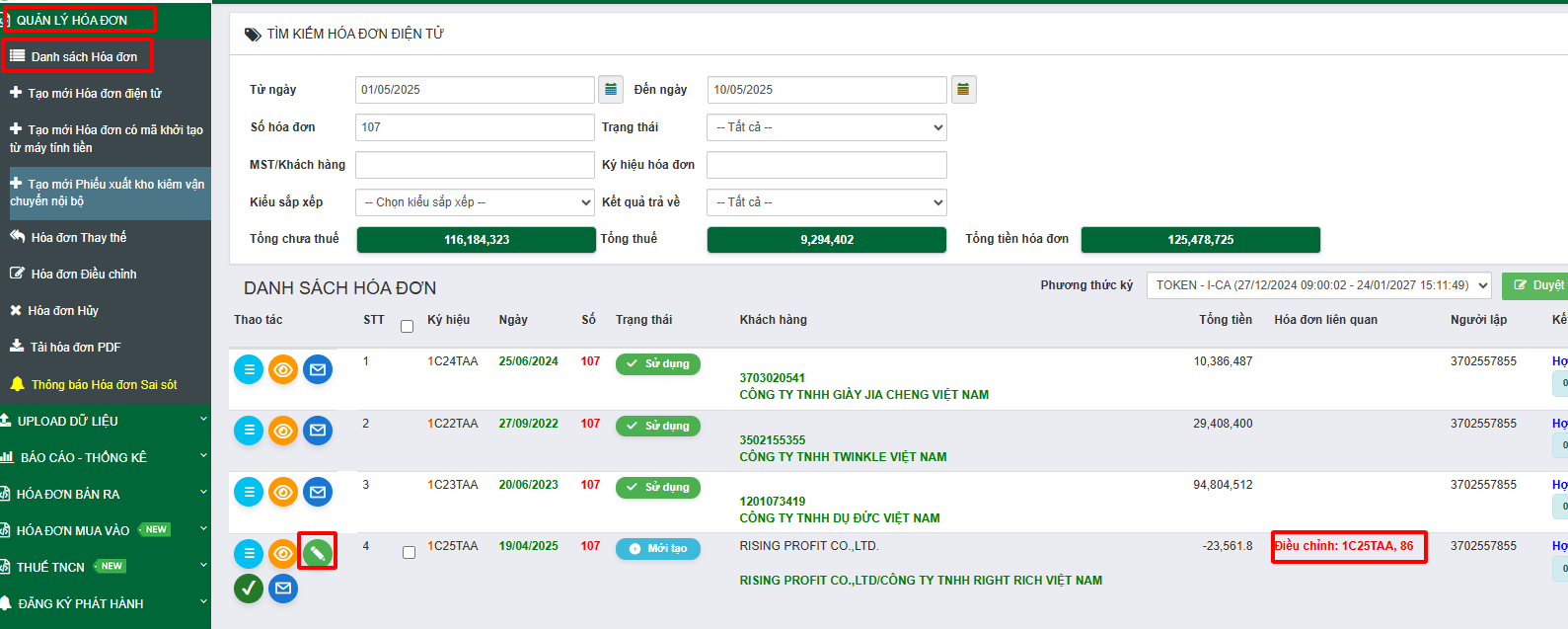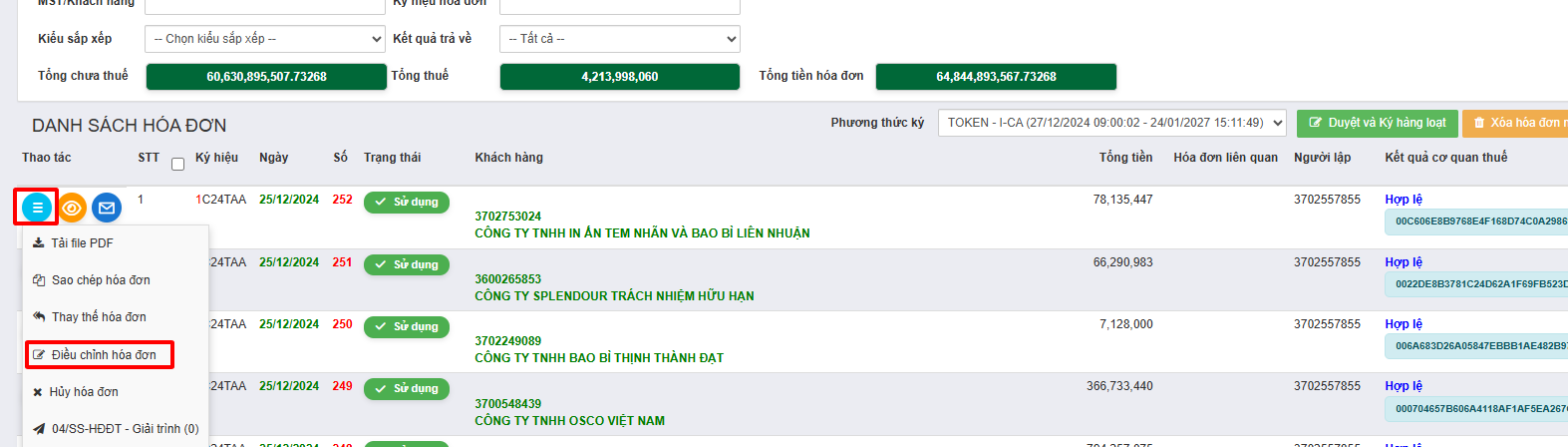 • B1: Ấn chuột phải vào biểu tượng  vào hóa đơn cần làm điều chỉnh