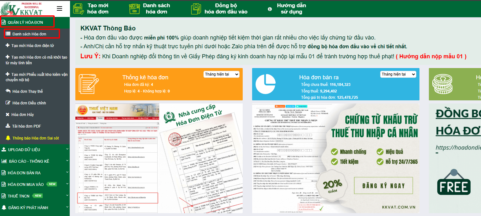- Bước 2: Tại giao diện danh sách hóa đơn KKVAT