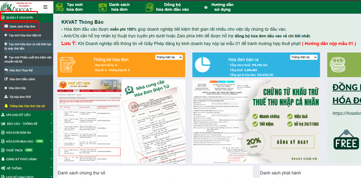 - Bước 2: Tại giao diện danh sách hóa đơn KKVAT